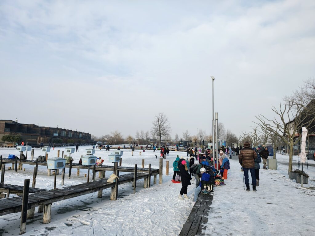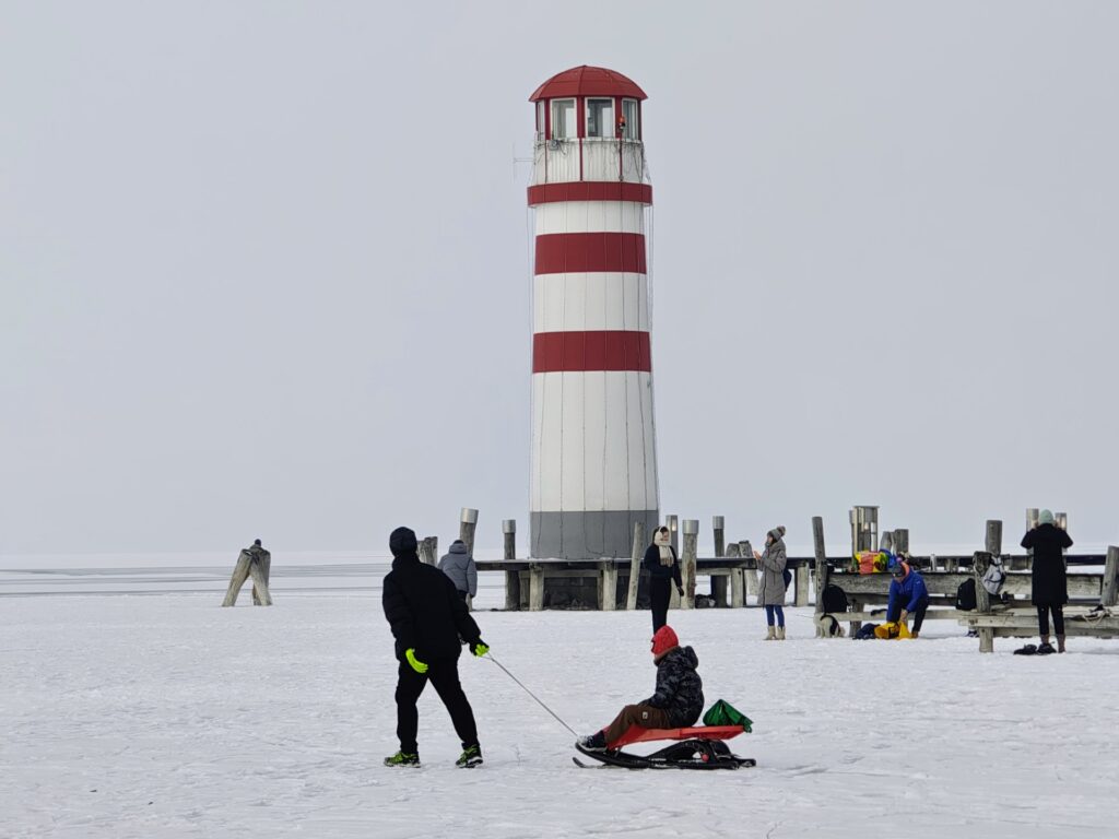 Az északi parton, Nezsidernél (Neusiedl am See) tele parkoló fogadott minket, a strandra vezető úton pedig gyalogosok, komplett családok tartottak le a partra. A jég itt a kisebb part menti öbölben sima, de a strand részen egy jó darabon durván darabos, egészen úgy néz ki, mint mikor a déli szél az első, éles jégdarabokat oda torlaszolta, azok pedig ott fagytak össze. Beljebb haladva már itt is sima jég fogad minket, ráadásul jégkite-ot, jégvitorlát is lehet bérelni. Az éhezőket food truck szolgálja.