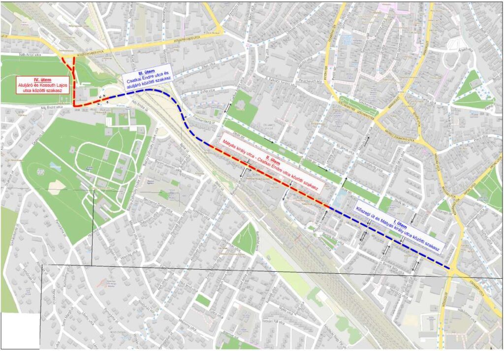 IV. ütem Mártírok útja Ady Endre és Kossuth Lajos utca közötti szakasz (teljes útzár mellett épül)